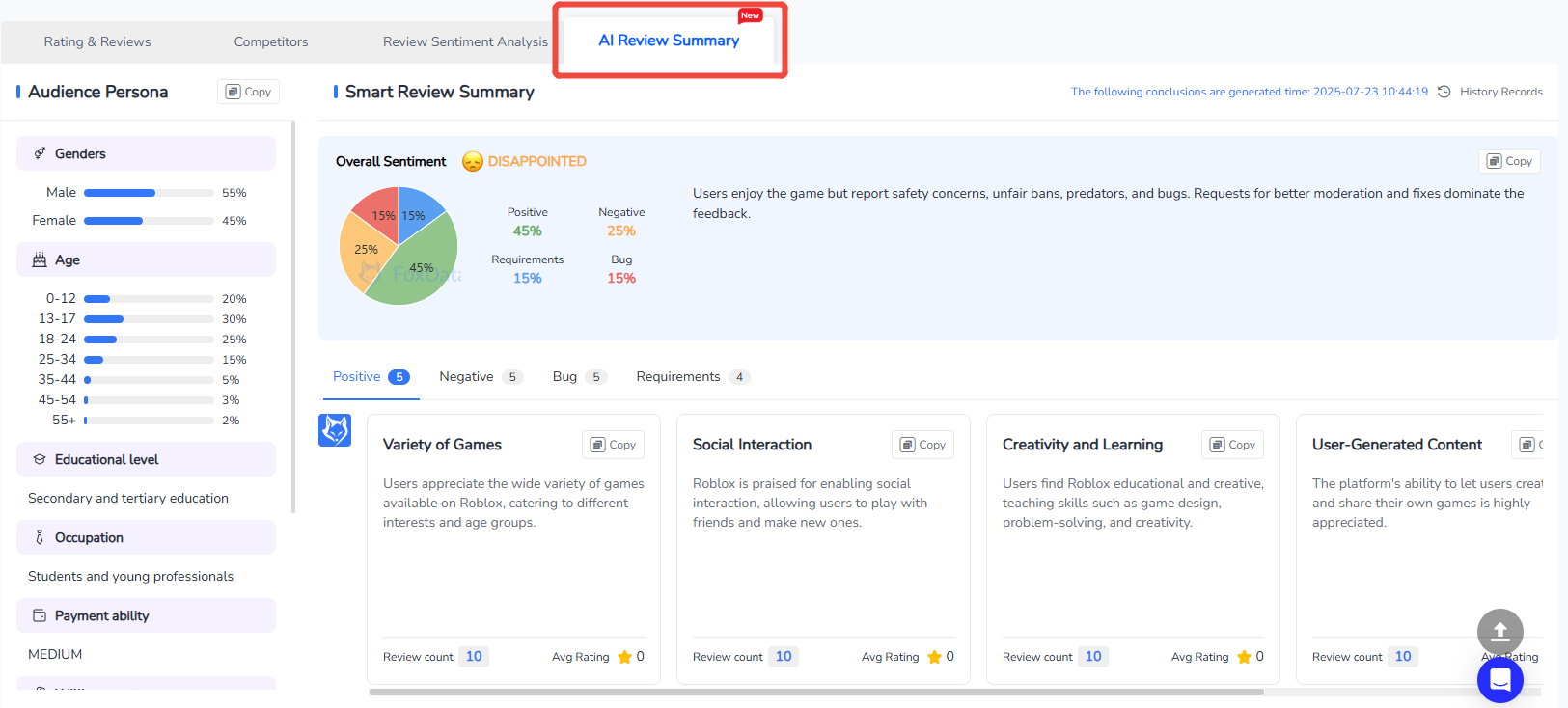 🔹 Stay focused — AI summarizes sentiment, condensing thousands of reviews into a few core pain points.