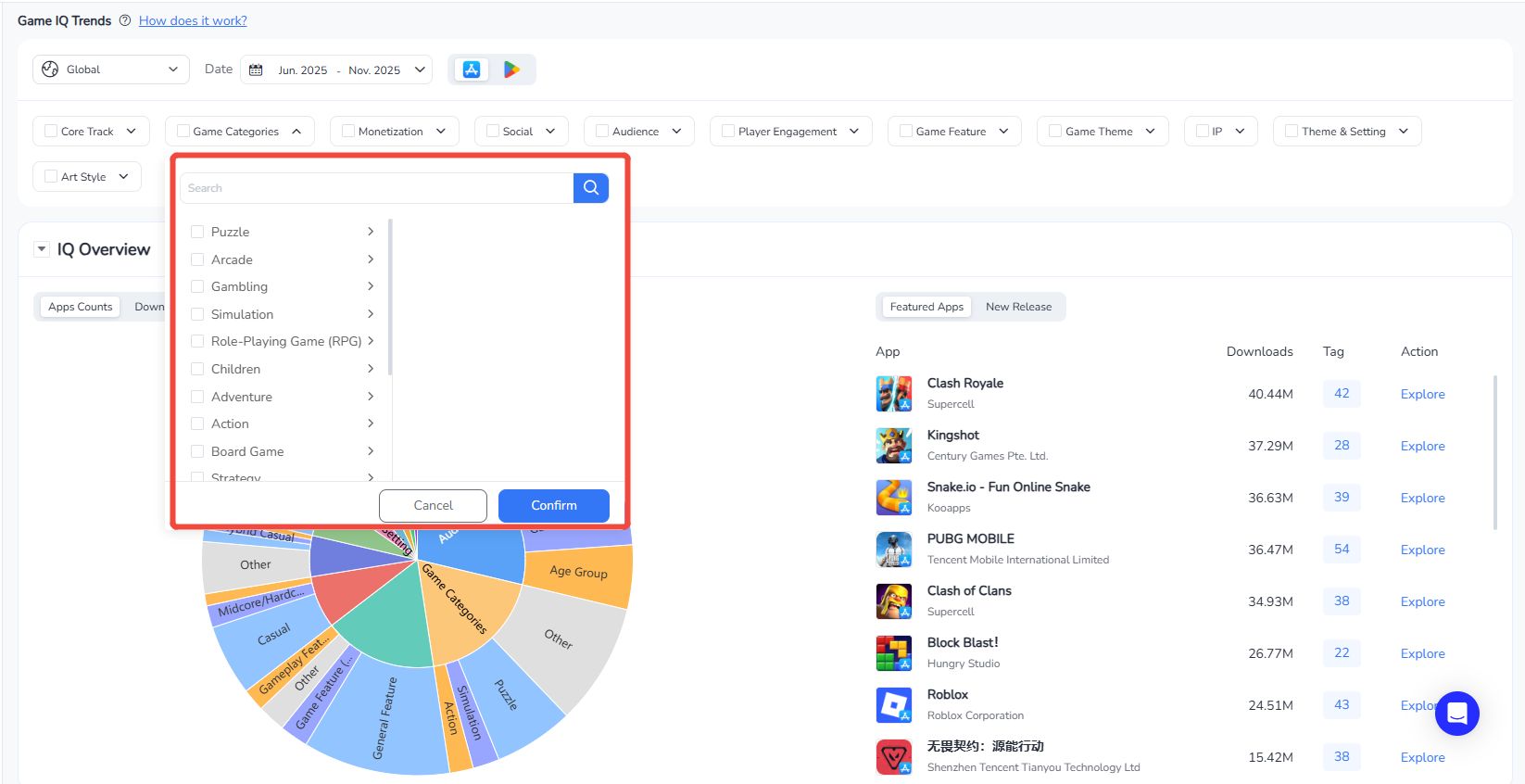FoxData のGameIQ は、あらゆるタイトルを、テーマ、アート スタイル、コア ゲームプレイ、収益化など、数千のラベルに分解し、すべてを一目で把握できるようにします。
