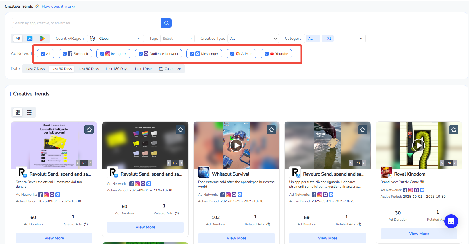 オムニチャネルの可視性- Facebook、YouTube、TikTok(近日公開)のパフォーマンスを同時に監視し、各クリエイティブの配信の強度と人気を特定します。
