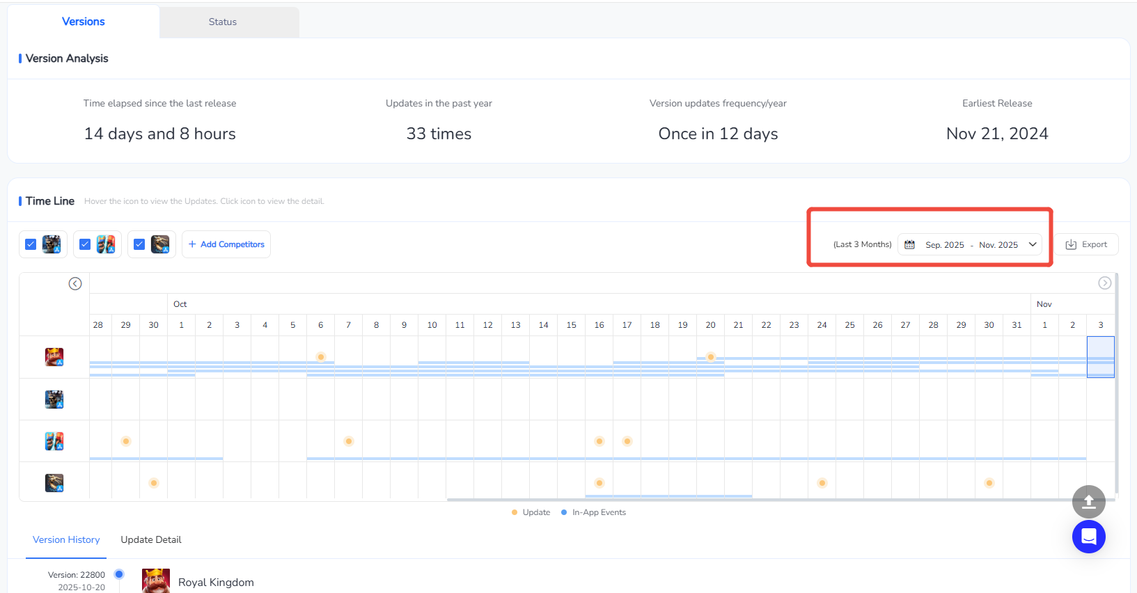 ●バージョン監視– 競合他社の更新リズムを追跡し、出荷するすべてのリリースがデータによって裏付けられます。