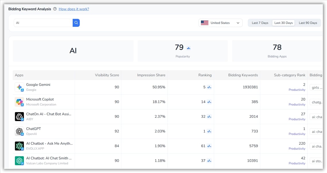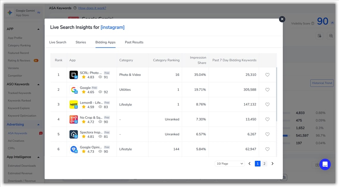 FoxData устраняет этот пробел в мониторинге, отслеживая эффективность ключевых слов в режиме реального времени . Благодаря Live Search Insights (например, как в примере ниже для « Instagram » ) вы можете точно увидеть, какие приложения активно предлагают свои ставки, их долю показов , рейтинг в категории и тенденции количества ключевых слов .